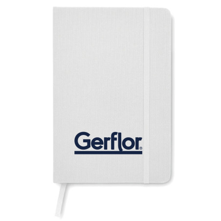 Carnet A5 avec couverture RPET 600D et 80 pages lignées en papier 100% recyclé avec bande élastique et ruban.